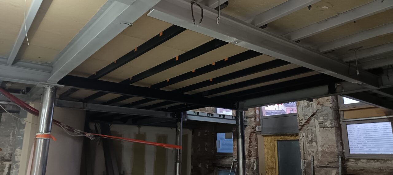 Certaines solives ont été moisées, tandis que les poutres ont été sondées et contrôlées et renforcés par le biais de profilés acier.